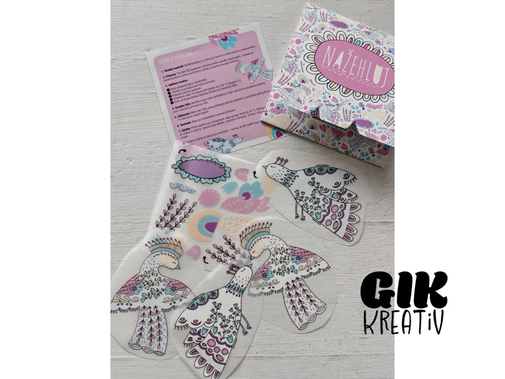 3. Aplikace motivu: Motiv ideálně lehce obstřihněte. Přiložte na požadované místo na textilu. Překryjte pečicím papírem. Žehlete po dobu 15 sekund při teplotě cca 150 °C (stupeň 2,5). Řiďte se doporučenou teplotou žehlení pro konkrétní látku.